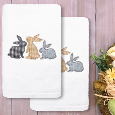 Your springtime decorations are not complete without lighthearted embroidered hand towels for your guest bath. Bunny Row hand towels feature a whimsical trio, decorated with mini gingham and stripe cloth appliques. These special & luxurious terry hand towels are manufactured with the finest Turkish cotton fiber for maximum softness and absorbency, and bring country charm to your home.