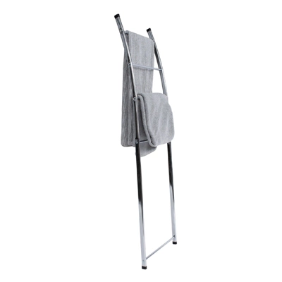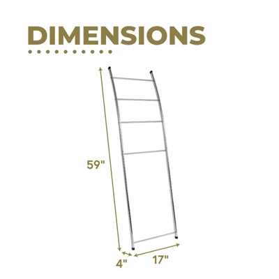 Contemporary ladder rack adds a splash of minimalist trendiness to homes. Smart design with 4 rungs accommodates various pieces such as towels, blankets, scarves, clothing, bags, and even newspapers or magazines in tight spaces. Its versatility makes it a perfect addition to bedrooms, bathrooms, living rooms, study room, and more. Functions as a drying rack, storage, and display. Each bar loads up to 5 lbs. with a total of 20 lbs. for the whole ladder. Boasting a tough steel tube body with chrome plating, the rack is designed to be hard-wearing, durable and can endure for many years. Rust resistant feature withstands highly humid places such as bathrooms, gym rooms, outdoor swimming pool, hot tubs, and the likes. No drilling needed. With the help of a screwdriver (not included), assembly can be completed in 10 minutes. Easy to clean. Simply wipe with cloth and cleaning agent. Package includes: 1 x towel ladder, 1 x setup instructions. Dimensions: 17” L x 4” W x 59” H. Weight: 4 lbs. Note: This ladder rack is for hanging items only. Do not use as an equipment for climbing.