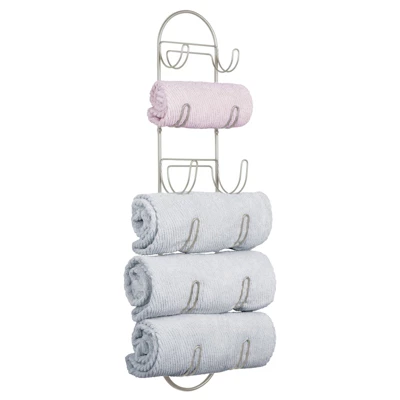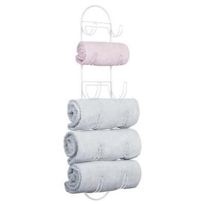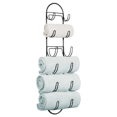 Add the feeling of hotel luxury with the Wall Mount Towel Storage Rack from mDesign. Great for storing full sized bath towels or bath sheets, hand towels and face towels either in your main bath or in a guest bathroom. Each arm is stylishly designed to hold towels and keep them securely in place but readily accessible for you or your guests! Its tiered design is a great space saver and easily mounts to a wall with the included hardware.