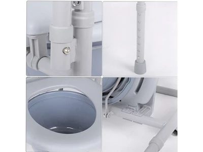 - 3 in 1 Commode – It is designed for use at bedside, as a raised Toilet Seat over a regular toilet, or as safety rails around a regular toilet. It can also be used as a porta potty for camping.