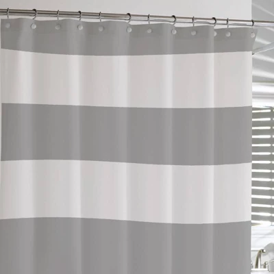 Stripe Shower Curtain is made from 100% cotton, with chic horizontal lines in grey and white is the best way to add stylishness to your bath. Its buttonhole top makes it easy for easy hanging. Curtain is washable and resilient for years of enjoyment adding simplicity to your bathroom decor . STANDARD 100 by OEKO-TEX certified.